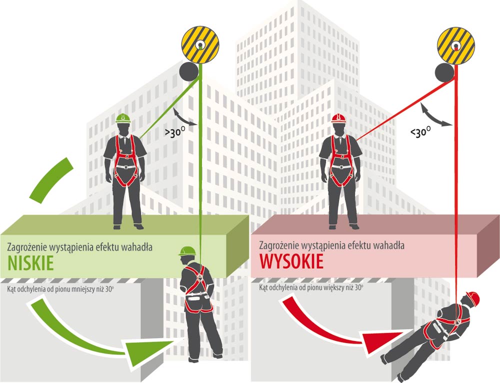 Zjawisko wahadła jest niebezpiecznym efektem ubocznym spadania polegającym na wahadłowym charakterze swobodnego upadku, podczas którego pojawia się ryzyko uderzenia w przeszkody znajdujące się z boku. Oddalenie się od pionu wyznaczonego przez linię poprowadzoną od punktu kotwiczenia prostopadle do podłoża zwiększa ryzyko wystąpienia efektu wahadła. Dodatkowo należy brać pod uwagę, że efekt wahadła może wpływać niewłaściwie na działanie i skuteczność określonych typów podzespołów łącząco-amortyzujących - np. urządzeń samohamownych. Z tego też względu należy dążyć do minimalizacji ryzyka wystąpienia efektu wahadła, a w wypadku konieczności przemieszczania się w płaszczyźnie poziomej na dużym obszarze, częstego zmieniania punktu kotwiczenia.