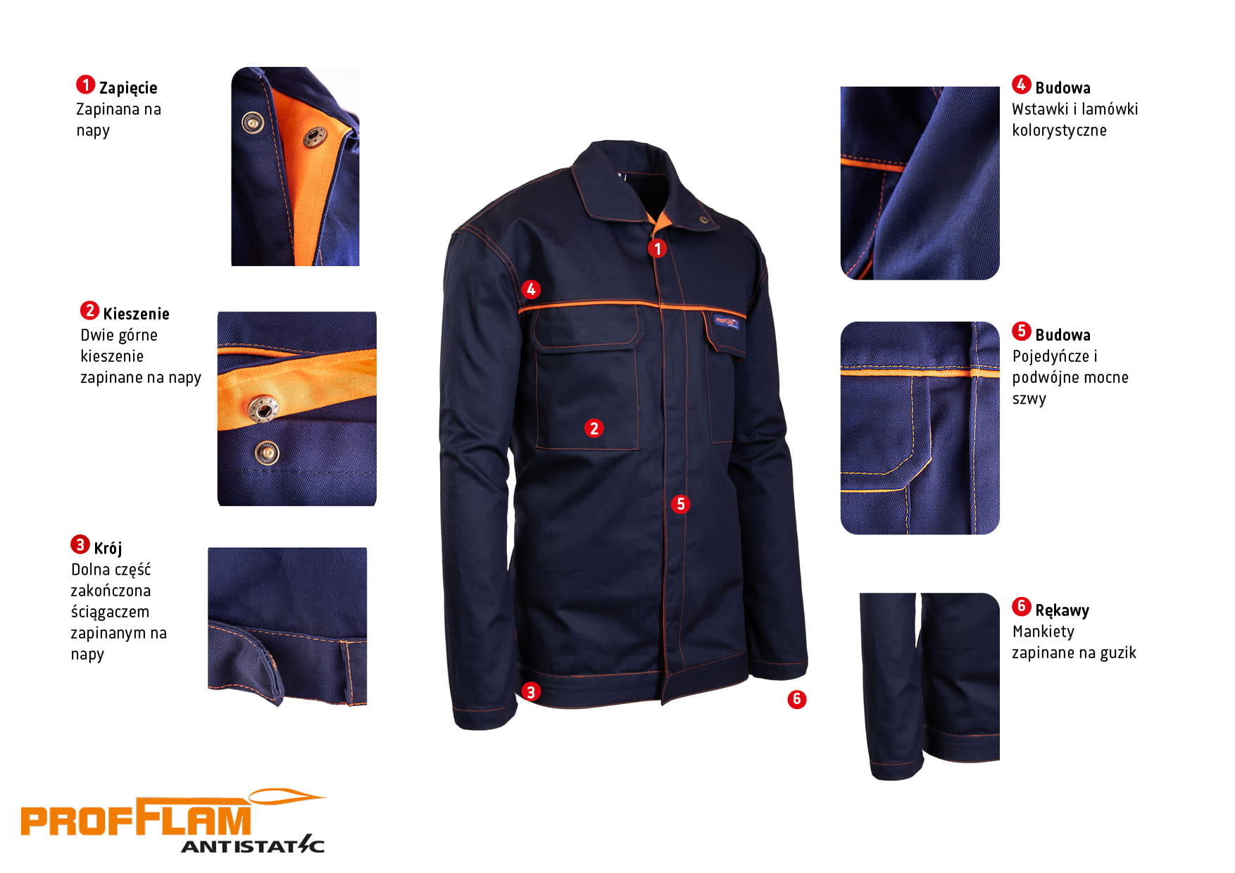 Bluza zapinana na napy, zabezpieczonych krytą listwą, co gwarantuje dodatkową ochronę. Zarówno pojedyncze, jak i podwójne szwy, szyte mocną nicią, zapewniają solidną konstrukcję oraz długotrwałą wytrzymałość. Dodatkowo, wstawki kolorystyczne i lamówki nadają bluzie estetyczny wygląd, co sprawia, że doskonale sprawdzi się w różnych środowiskach pracy.