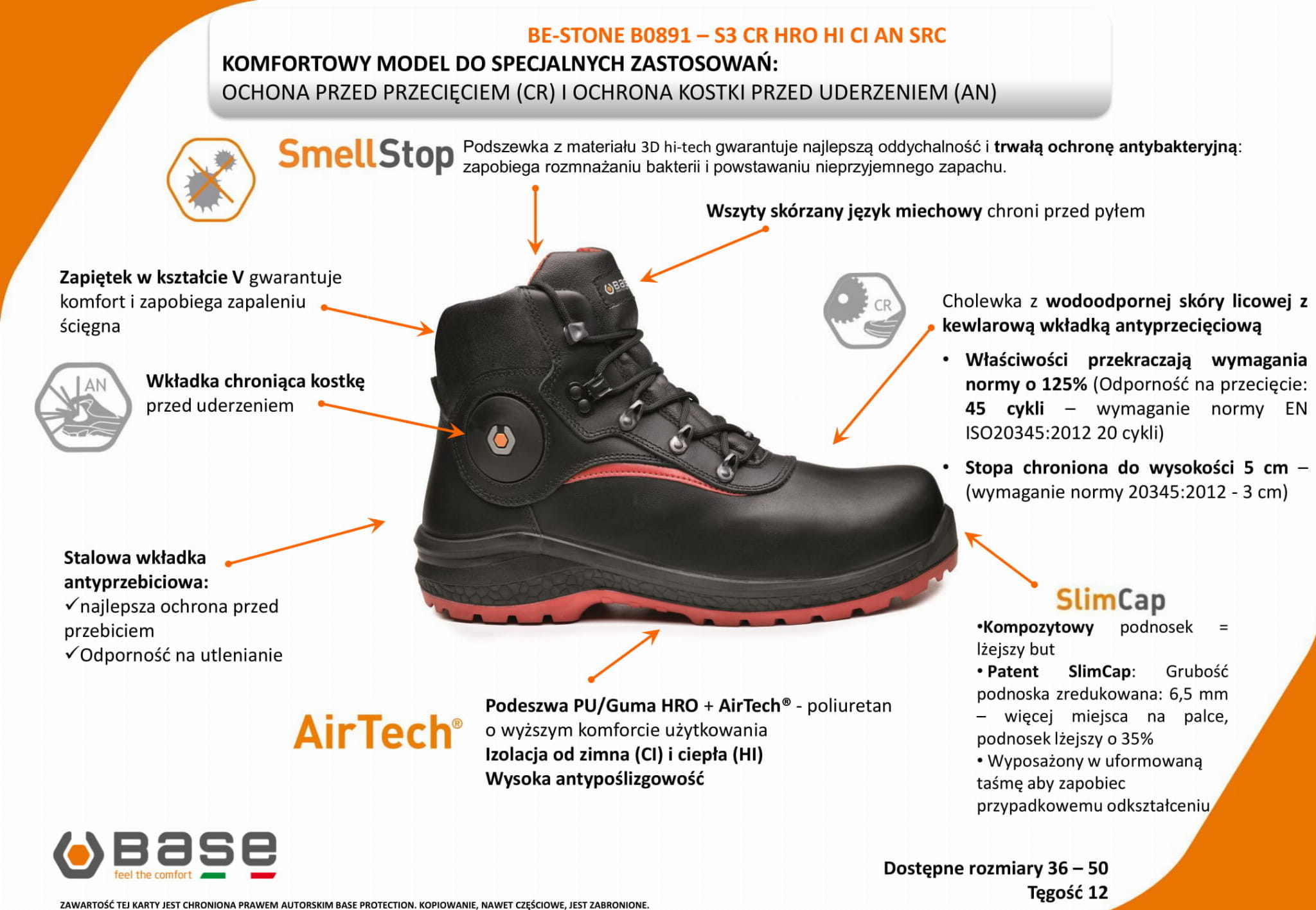 Cholewka z wodoodpornej skóry licowej w jednym kawałku z kewlarową wkładką antyprzecięciową. Wkładka chroniąca kostkę przed uderzeniem. Wszyty język chroni przed pyłem. Podszewka trzewika z materiału 3D Hi-Tech zapewnia oddychalność oraz ochronę antybakteryjną. Podeszwa Air-Tech to technologia opracowana przez Base Protection aby poprawić przyczepność - wysoka antypoślizgowość. Podeszwa PU/Guma HRO + AirTech® - poliuretano wyższym komforcie użytkowania. Izolacja od zimna (CI) i ciepła (HI). Stalowa wkładka antyprzebiciowa zgodnie z normą EN ISO 20345. Lekki podnosek kompozytowy powoduje że obuwie jest naprawdę lekkie. Patent SlimCap: Grubość podnoska zredukowana: 6,5 mm– więcej miejsca na palce, podnosek lżejszy o 35%, Wyposażony w uformowaną taśmę aby zapobiec przypadkowemu odkształceniu.