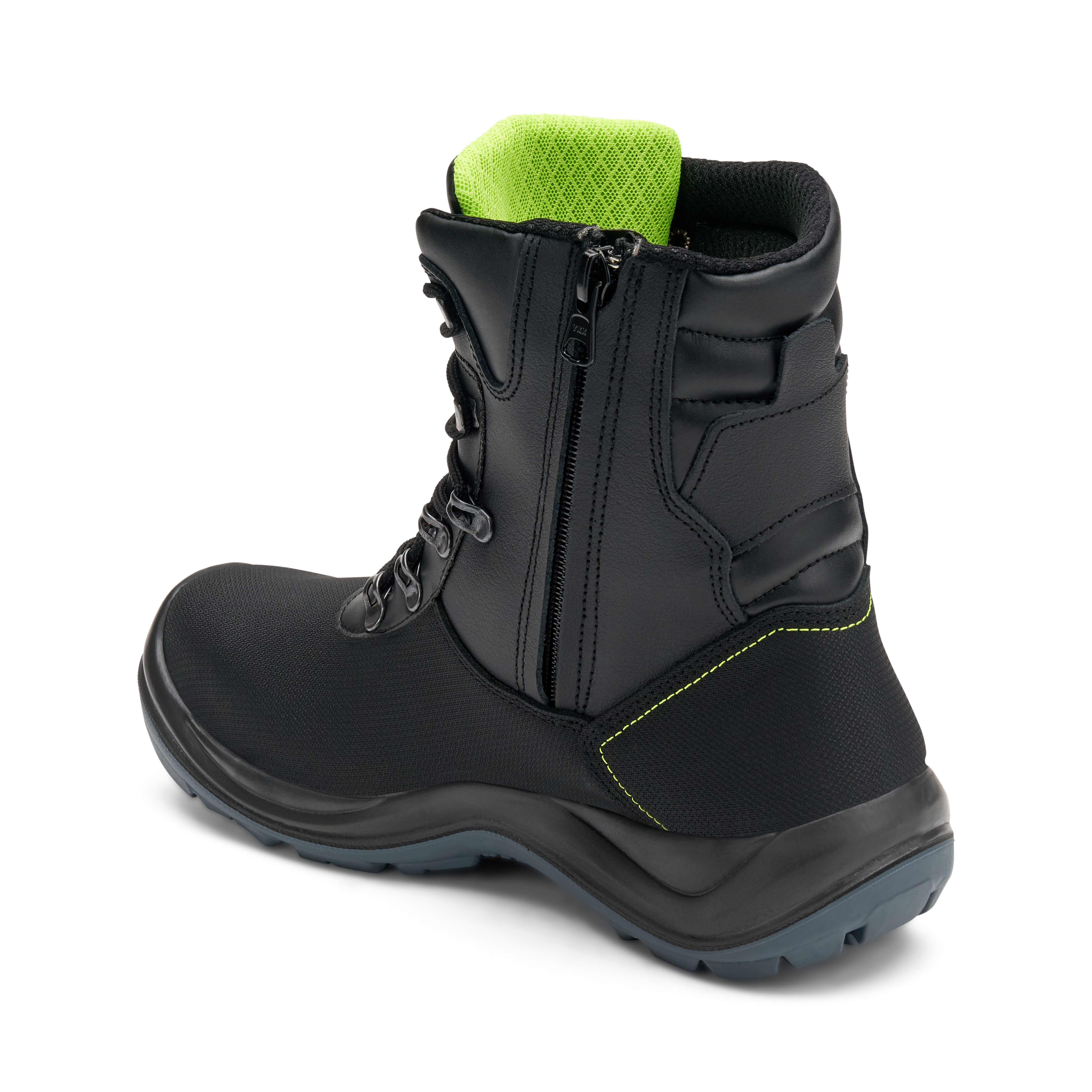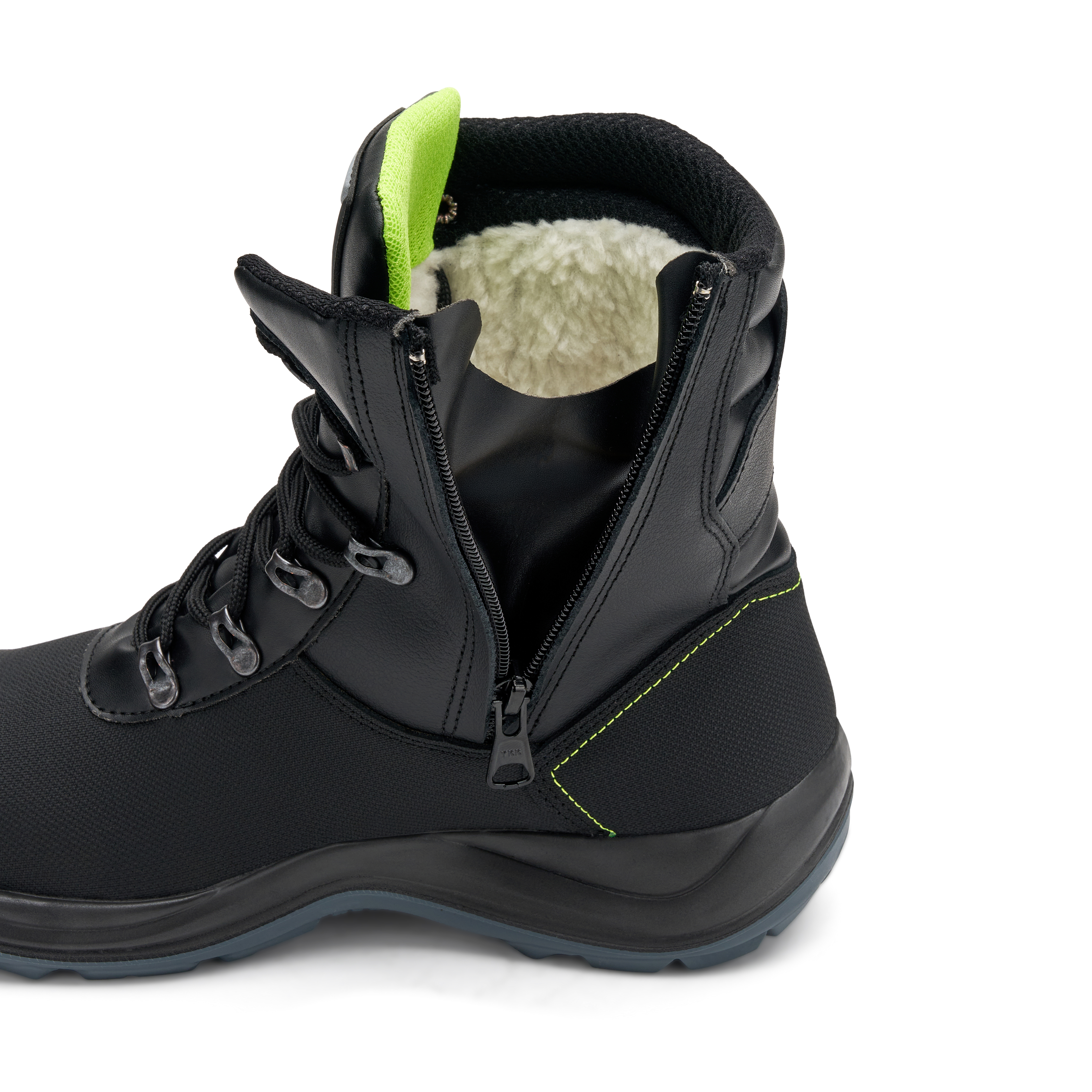 Buty ochronne Giasco ARTIC to wysokie, sięgające łydki obuwie klasy S3 CI HI WR HRO SRC, stworzone do pracy w bardzo wymagających i niskotemperaturowych warunkach. Wykonane z odpornej na zarysowania skóry WRU o grubości 1,8–2,0 mm, z ocieplającym filcem i membraną Wintherm®, zapewniają ochronę przed zimnem, gorącem, wilgocią i poślizgiem. Dodatkowo zastosowano elementy odblaskowe, miękko wyściełany język oraz zamek błyskawiczny dla łatwego zakładania.