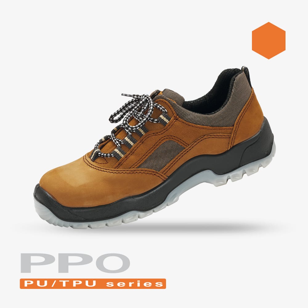 Półbuty bezpieczne z dwuwarstwową podeszwą PU/TPU: bieżnik wykonany z litego transparentnego poliuretanu termoplastycznego, międzypodeszwa wykonana ze spienionego poliuretanu komórkowego, odporna na oleje, benzynę i inne rozpuszczalniki organiczne.