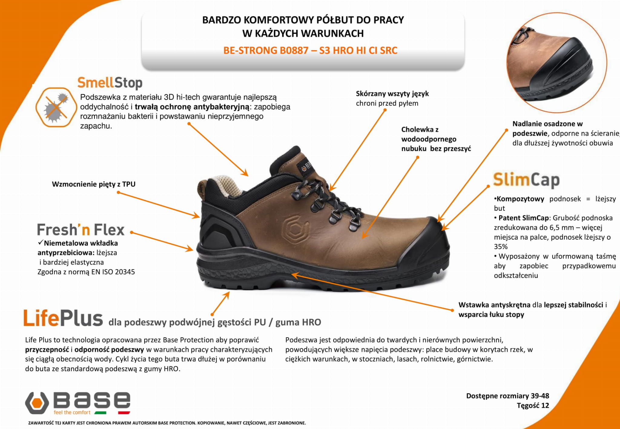 Półbuty Base BE-STRONG B0887 S3, HRO, CI, SRC / CLASSIC PLUS. Cholewka z wodoodpornej skóry licowej+ nalanie z przodu osadzone w podeszwie. Wzmocnienie pięty z TPU. Wszyty język chroni przed pyłem. Podszewka półbuta z materiału 3D Hi-Tech zapewnia oddychalność oraz ochronę antybakteryjną. Podeszwa Life Plus to technologia opracowana przez Base Protection aby poprawić przyczepność i odporność podeszwy, wstawka antyskrętna dla lepszej stabilności i wsparcia łuku stopy. Niemetalowa wkładka antyprzebiciowa zgodnie z normą EN ISO 20345. Lekki podnosek kompozytowy powoduje że obuwie jest naprawdę lekkie.