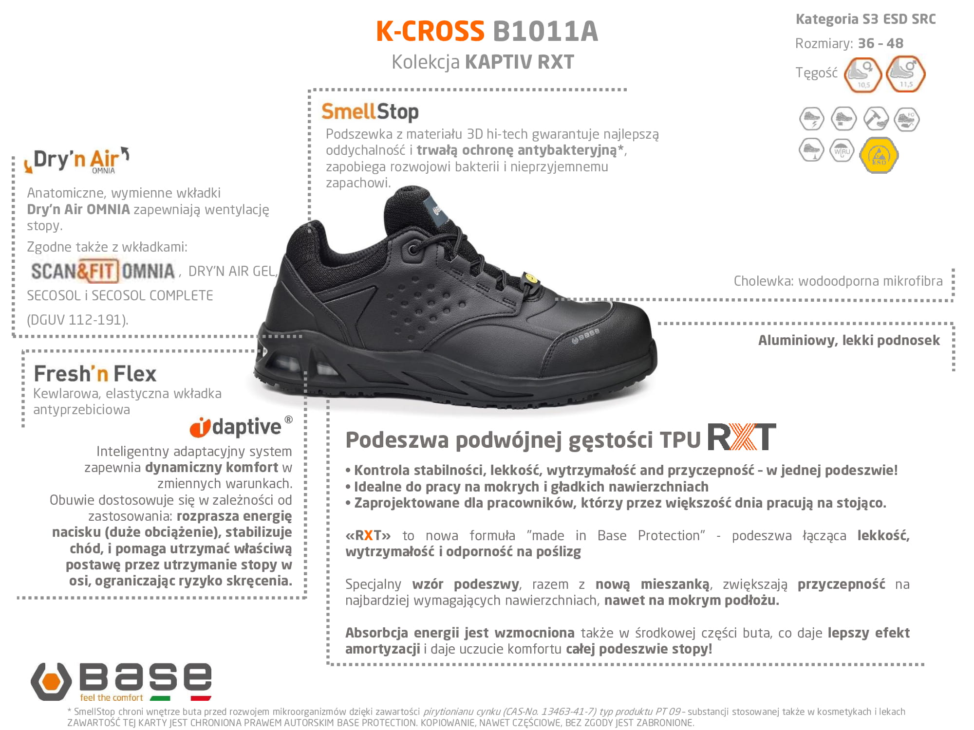 Półbuty Base K-CROSS B1011 S3, ESD, SRC / KAPTIV RTX to komfortowe obuwie dla tych którzy pracują na stojąco. Obuwie ESD, z podnoskiem i wkładką antyprzebiciową. Norma 20354:2011. Wkładka DrynAir - wysoka oddychalność stopy. Podszewka 3D HiTech - SmellStop - oddychalność i ochrona antybakteryjna.Podeszwa podwójnej gęstości TPU