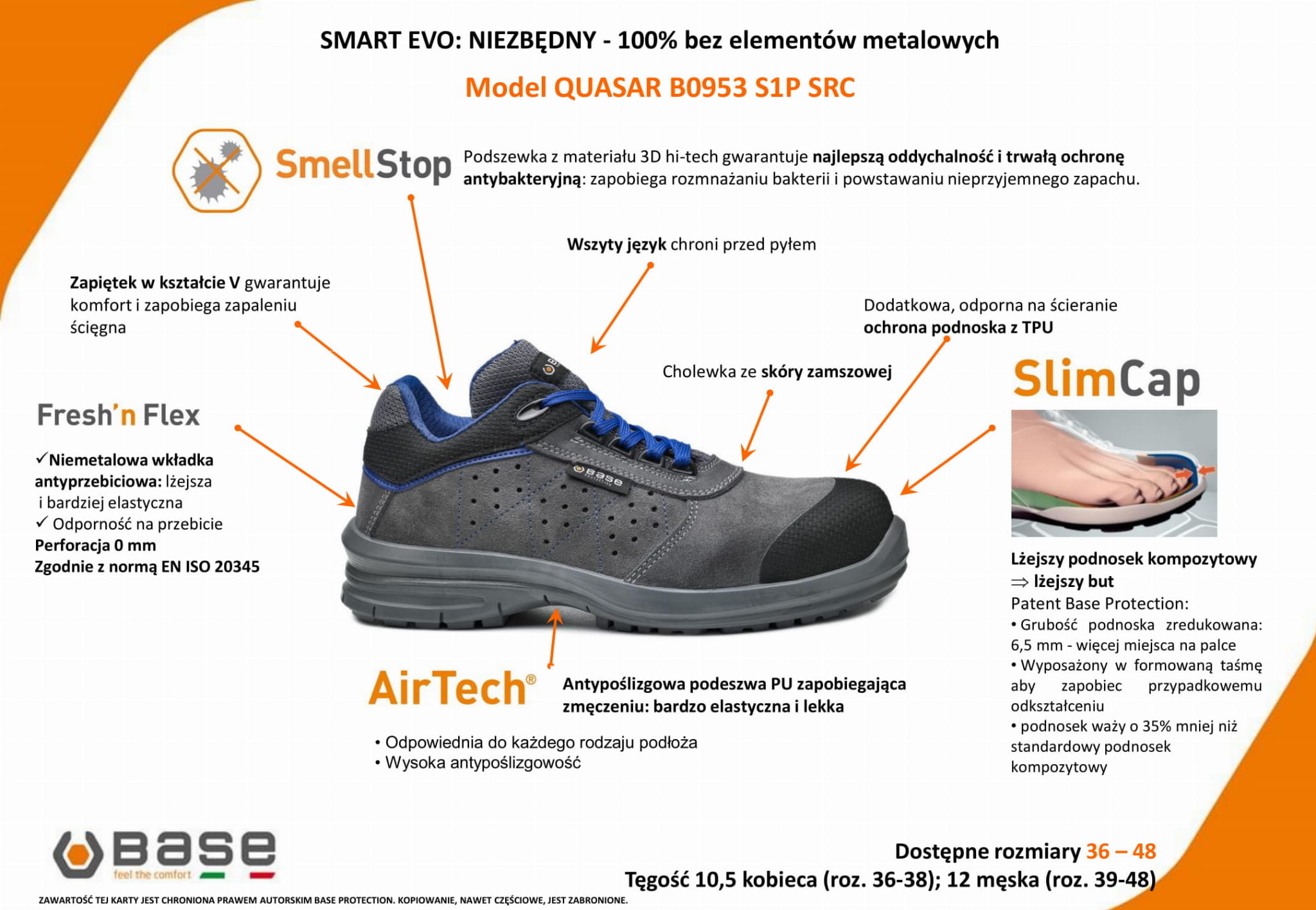 Półbuty Base QUASAR B0953 S1P SRC na natypoślizgowej uniwersalnej podeszwie. Cholewka oddychająca ze skóry zamszowej. Podszewka obuwia wykonana z materiału 3D Hi-Tech - oddychalność trwała ochrona antybakteryjna. Kompozytowy podnosek + ochrona podnoska z TPU odpornego na ścieranie. Podeszwa AirTech - jest elastyczna i zapobiega zmęczeniu stóp.