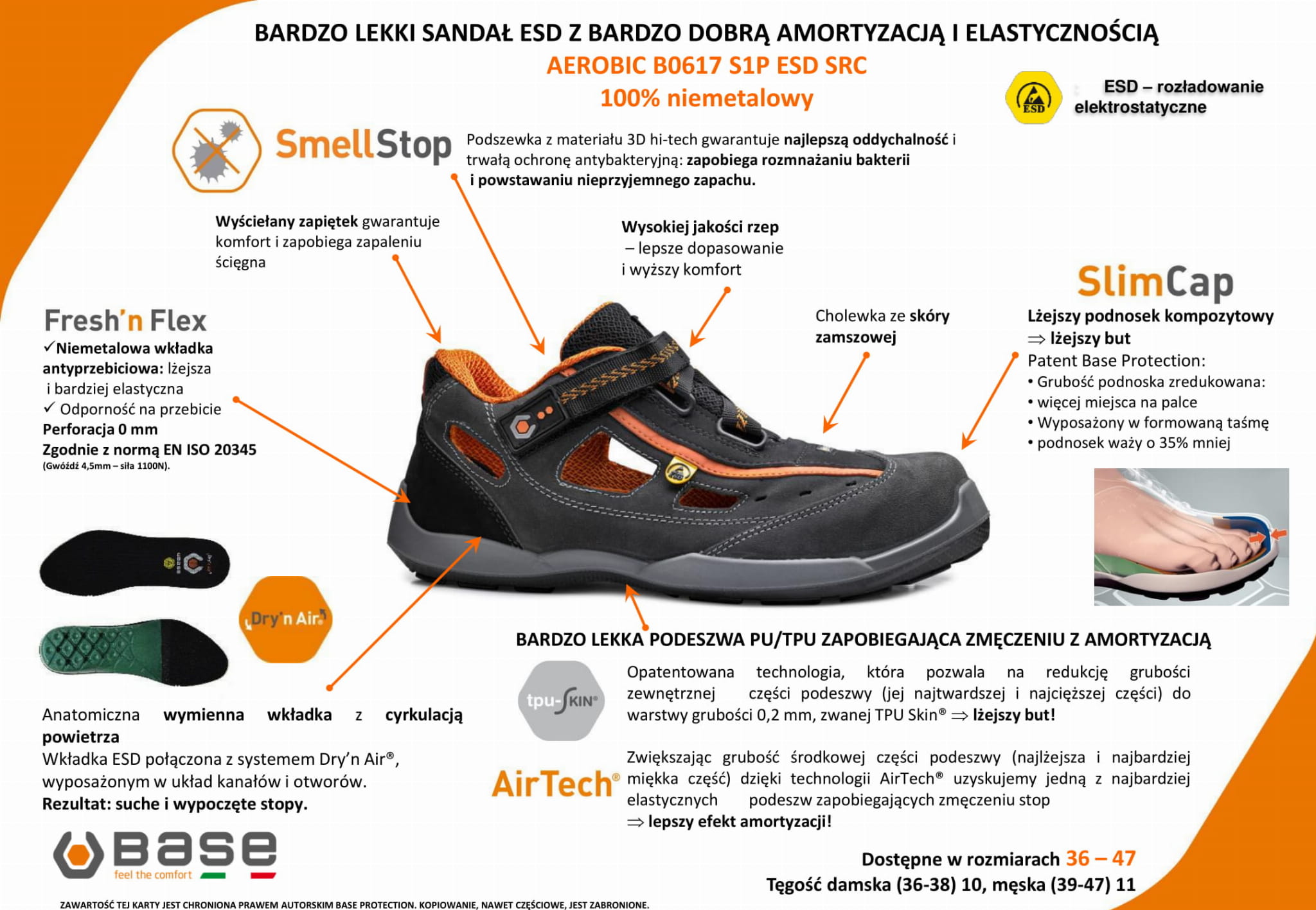 Sandały Base AEROBIC B0617 S1P, ESD, SRC. Cholewka ze skóry zamszowej. Podszwka półbuta z materiału 3D Hi-Tech zapewnia oddychalność oraz ochronę antybakteryjną. Podeszwa typu skin - niskoprofilowa w technologii AirTech - zapobiega zmęczeniu stóp oraz poprawia miękkość i amortyzację. Niemetalowa wkładka antyprzebiciowa zgodnie z normą EN ISO 20345. Lekki podnosek kompozytowy powoduje że obuwie jest naprawdę lekkie. Wkładka z cyrkulacją powietrza.