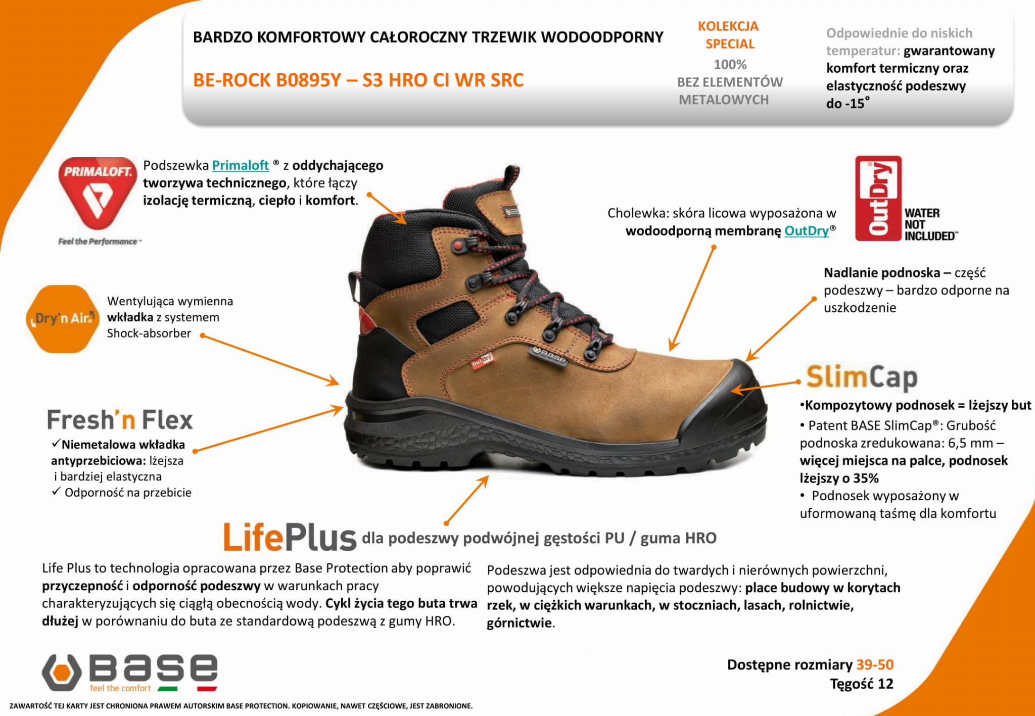 Trzewiki Base BE-ROCK B0895Y S3, HRO, HI, CI, WR, SRC / SPECIAL. Cholewka z wodoodpornej skóry licowej w jednym kawałku, wyposażona w wodoodporną membranę OutDry + nadlanie stanowiące długotrwałą ochrona podnoska z TPU , odporne na ścieranie. Podszewka Primaloft ® z oddychająceg otworzywa technicznego, które łączy izolację termiczną, ciepło i komfort.