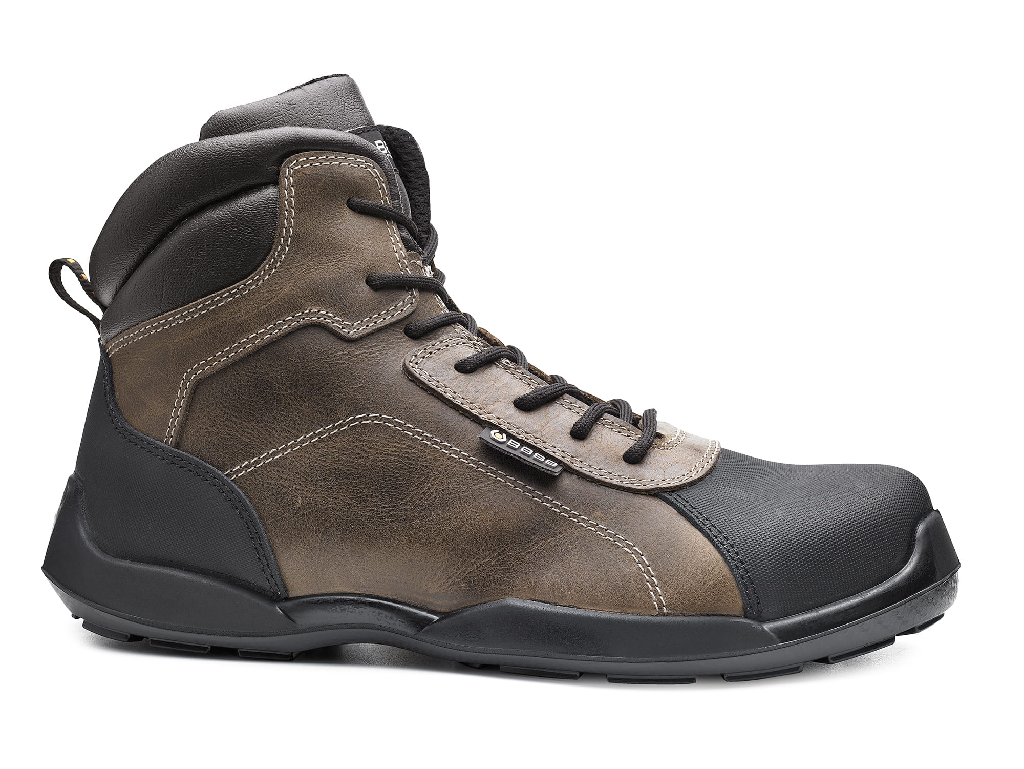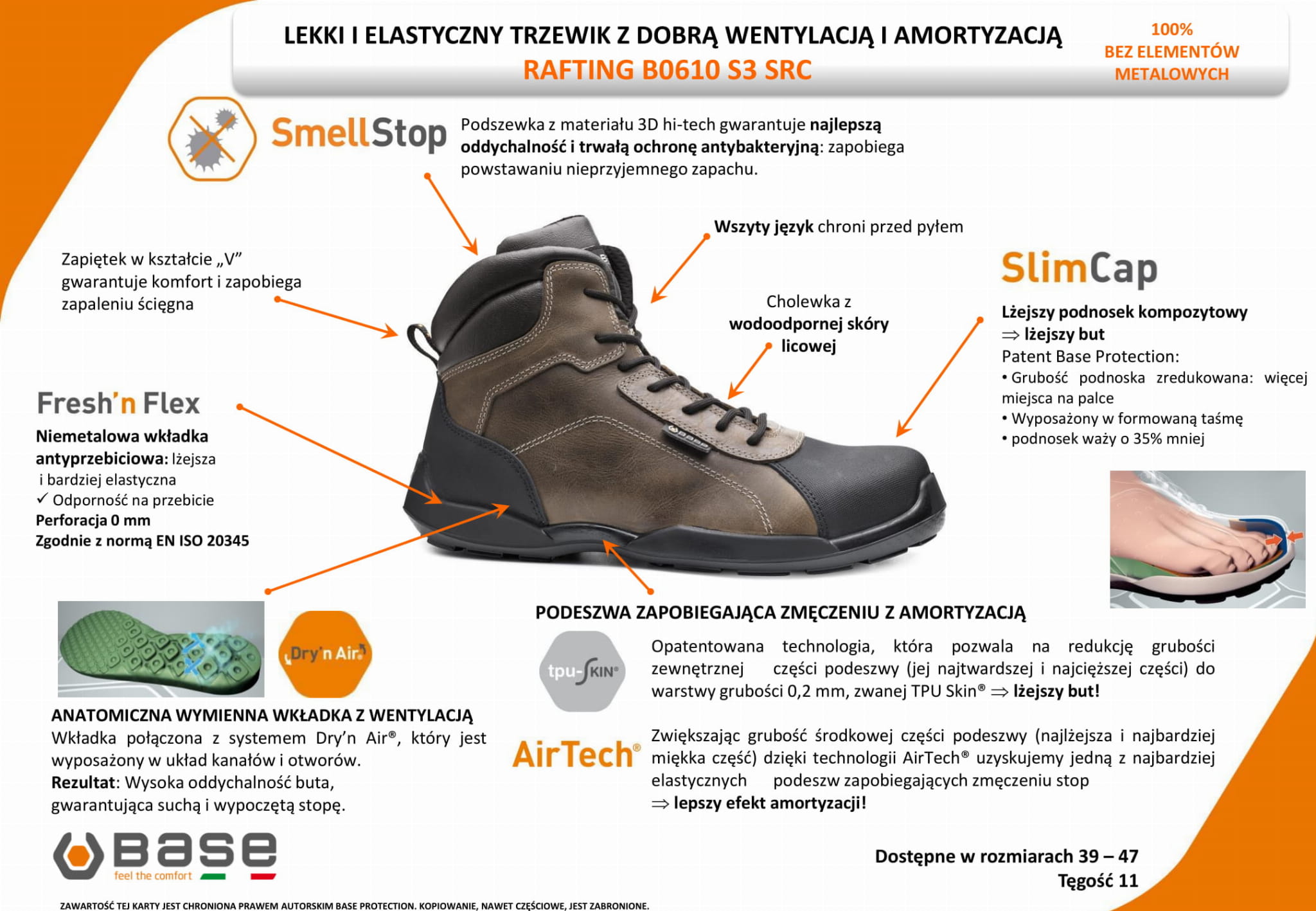 Trzewiki Base RAFTING TOP B0610 S3, SRC. Cholewka z woskowanej skóry. Podszewka trzewika z materiału 3D Hi-Tech zapewnia oddychalność oraz ochronę antybakteryjną. Podeszwa typu skin - niskoprofilowa w technologii AirTech - zapobiega zmęczeniu stóp oraz poprawia miękkość i amortyzację. Niemetalowa wkładka antyprzebiciowa zgodnie z normą EN ISO 20345. Lekki podnosek kompozytowy powoduje że obuwie jest naprawdę lekkie. Wkładka z cyrkulacją powietrza.