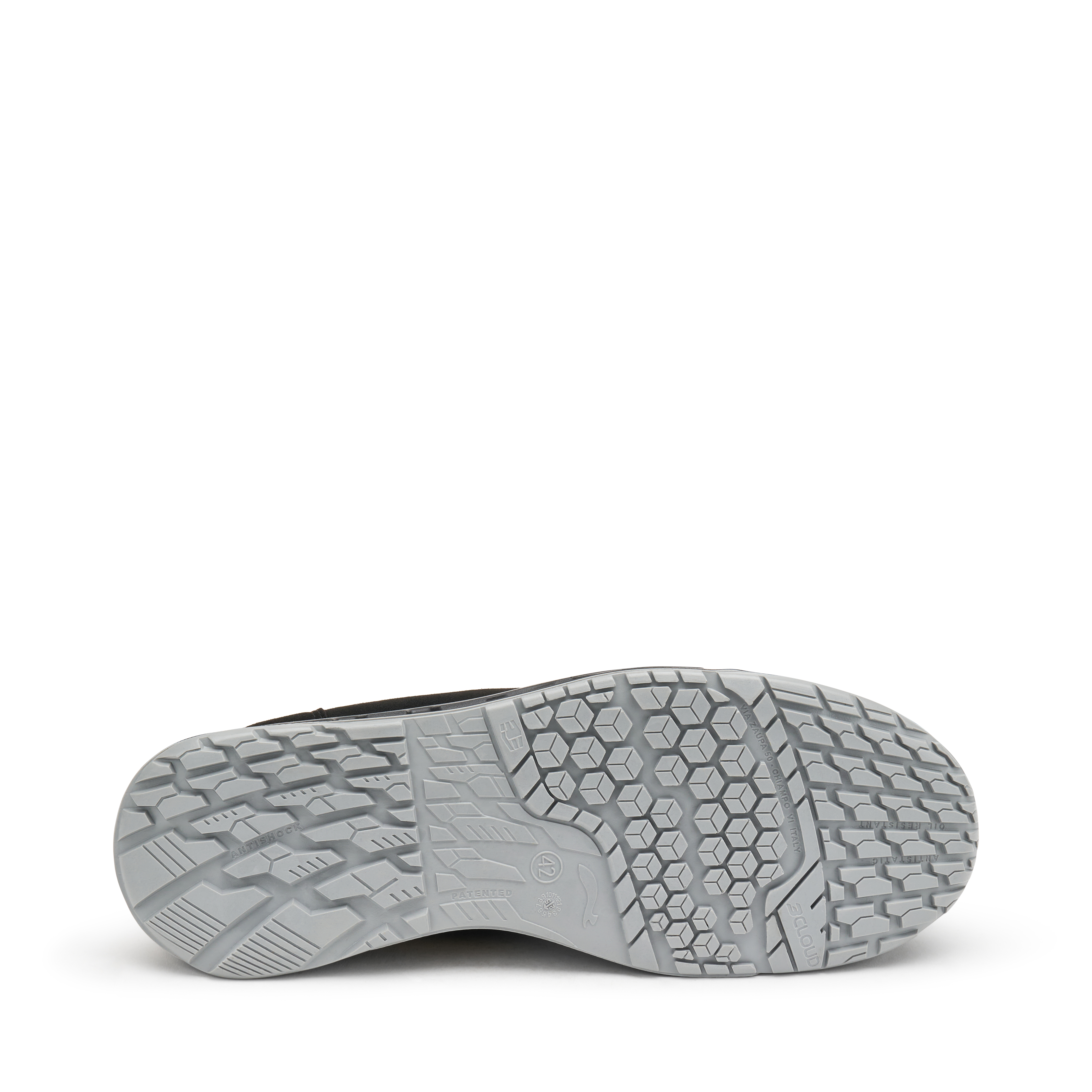 - Podeszwa 3CLOUD – wykonana z trójgęstościowego poliuretanu, antystatyczna, odporna na hydrolizę (ISO 5423:92), węglowodory, ścieranie, uderzenia oraz poślizg.