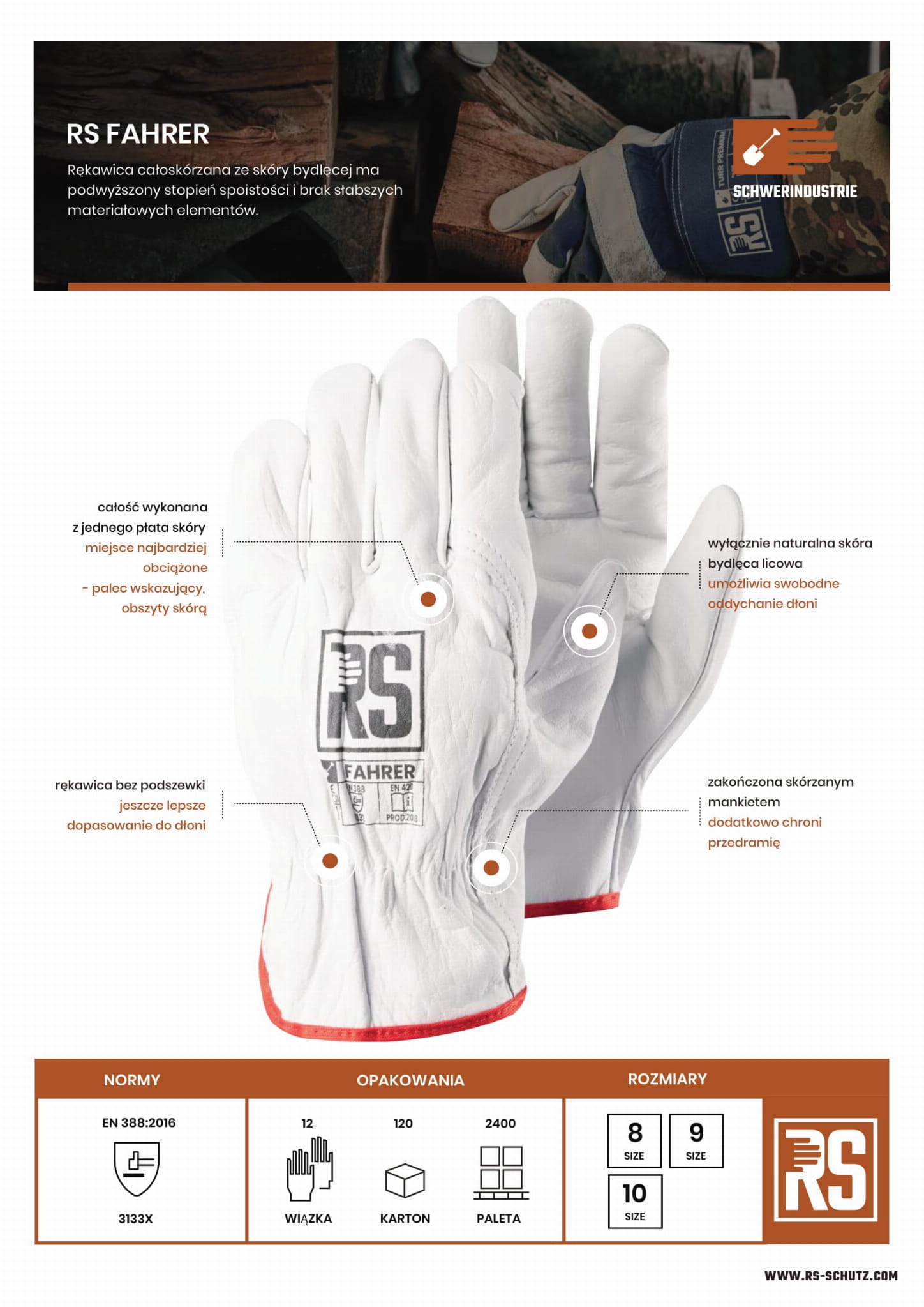 Rękawice robocze RS FAHRER. To rękawice ochronne kat. II, wykonae ze skóry licowej bydlęcej.