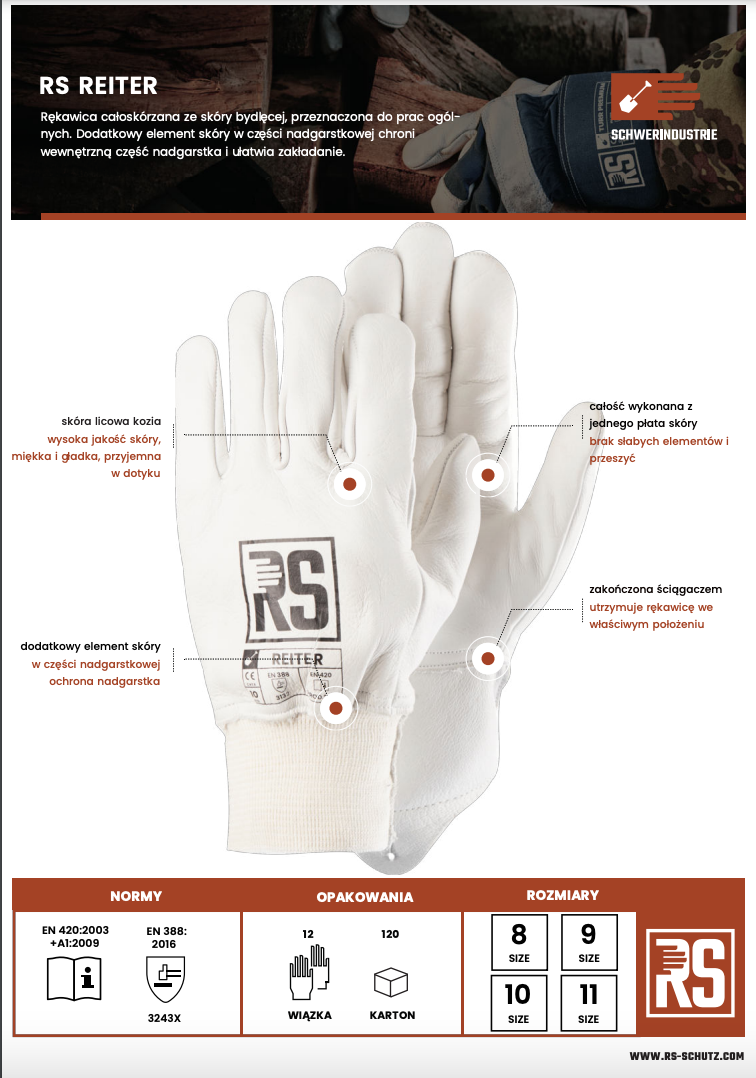 RS Reiter to wysokiej jakości rękawice ochronne wykonane w całości z jednego kawałka skóry bydlęcej. Dzięki solidnemu wykonaniu zapewniają wyjątkową trwałość oraz wysoką odporność na uszkodzenia mechaniczne.
