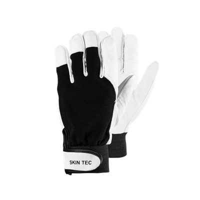 RS SKIN TEC to rękawice ochronne kategorii II wykonane z wysokiej jakości miękkiej skóry licowej koziej oraz trwałego drelichu w kolorze czarnym. Zastosowanie naturalnej skóry zapewnia wyjątkową elastyczność, czucie w palcach i doskonałą ergonomię pracy, co sprawia, że rękawice idealnie sprawdzają się przy zadaniach wymagających precyzji i delikatności.