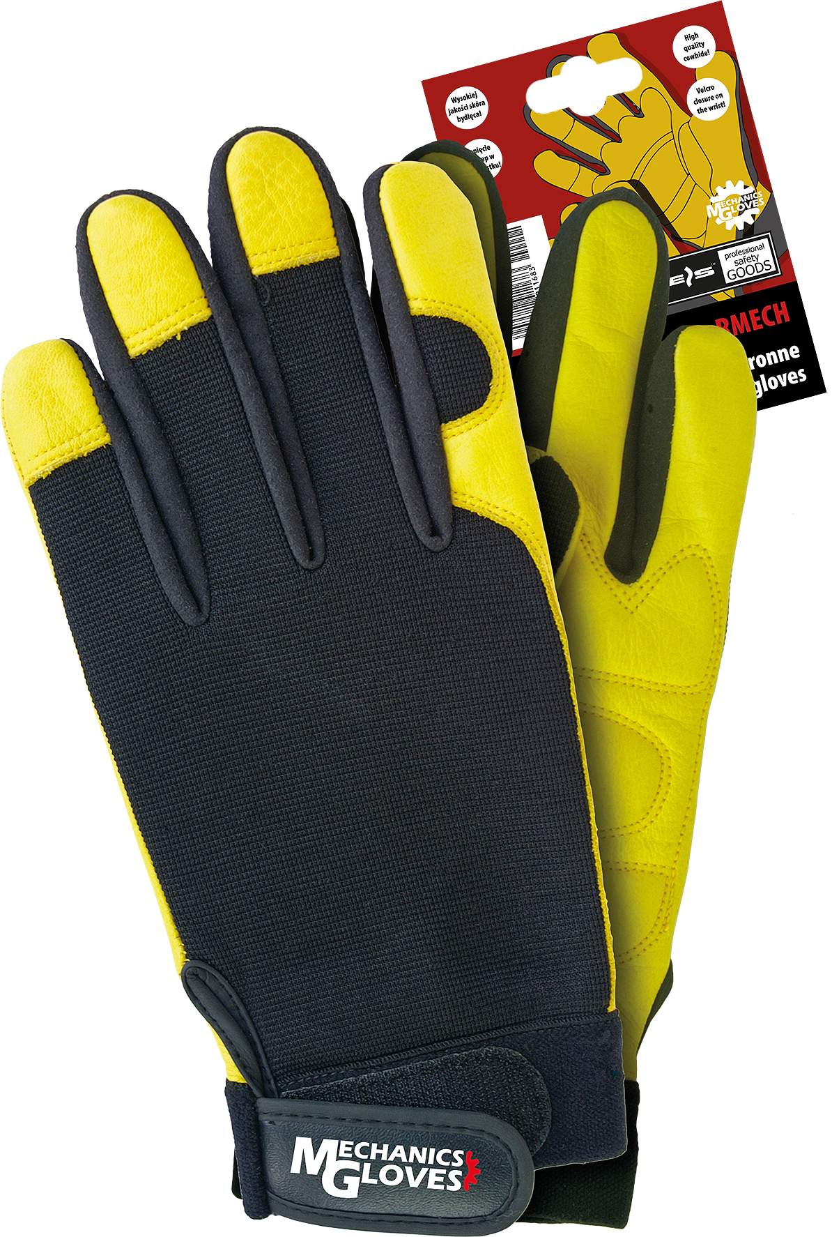 Rękawice ochronne RMECH zostały wykonane z wysokiej jakości skóry bydlęcej połączonej z czarną tkaniną.