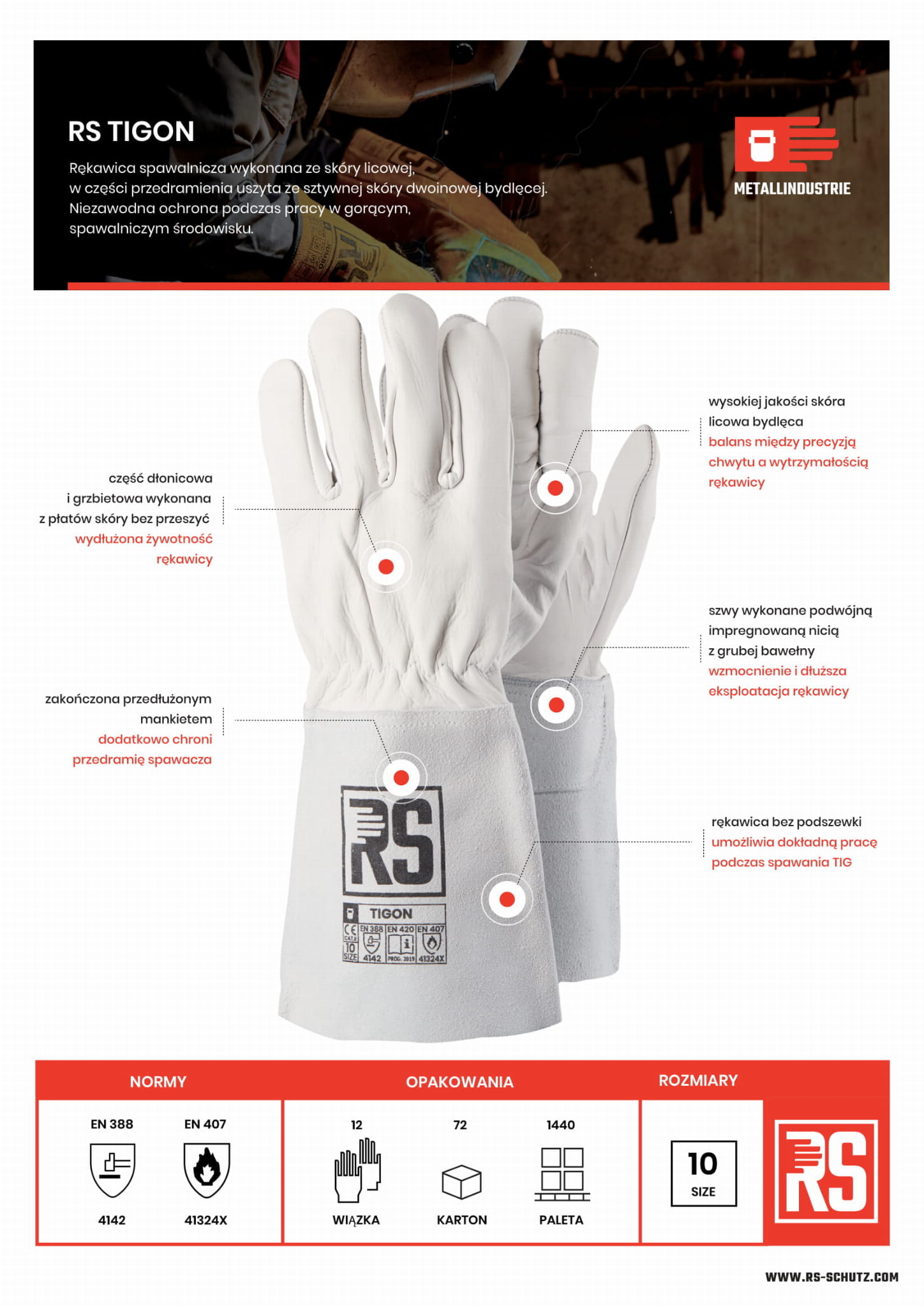 Przeznaczona do spawania TIG, uszyta ze skóry licowej bydlęcej, mankiet wzmocniony skórą dwoinową, szwy podwójnie impregnowane, umożliwia precyzję chwytu lancy, zwiększona wytrzymałość.