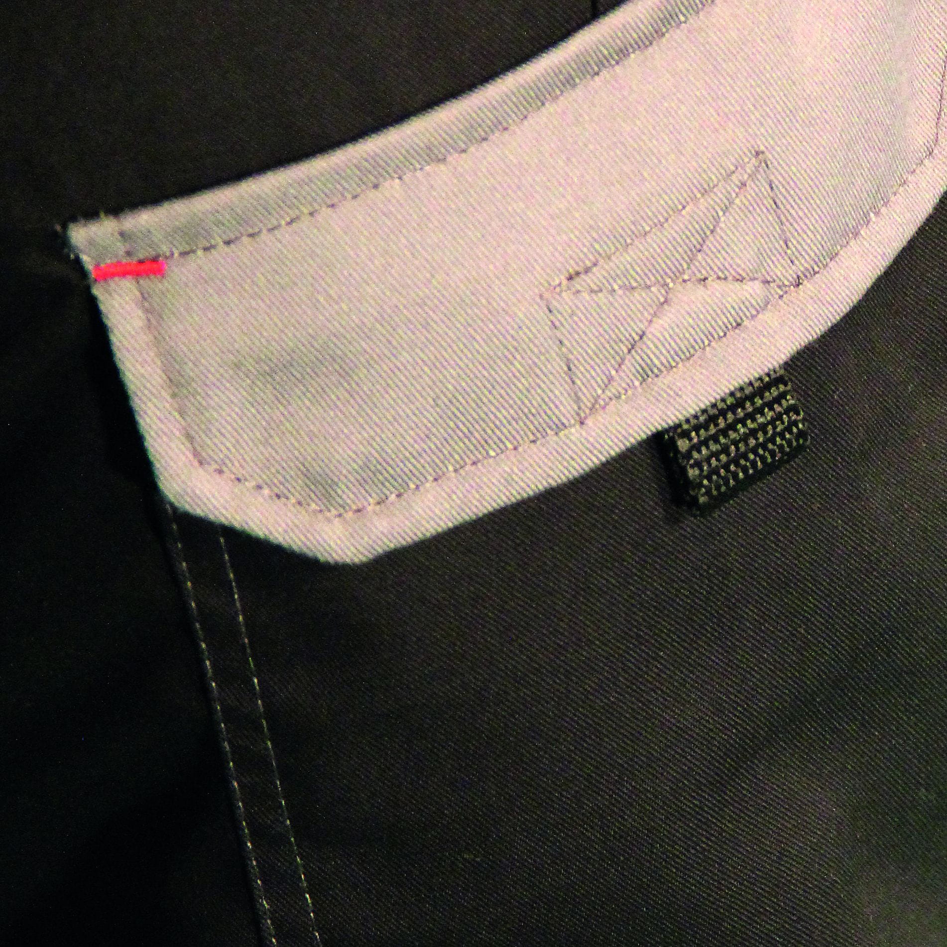 - dwie kieszenie wpuszczane z zaokrąglonymi otworami z widoczną częścią kontrastową worka kieszeniowego,