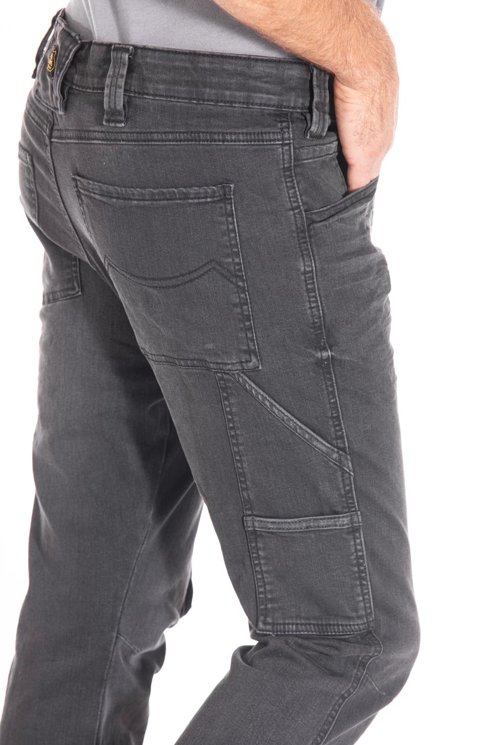 Jeansy robocze z wieloma kieszeniami, wysoki stan, podwójny pas wewnętrzny z "antypoślizgową" gumką, braguette zapinana na zamek, wygodne udo z kieszenią na telefon komórkowy, prosta nogawka z zaciskami kolanowymi, szczotkowany® dżins, 98% bawełna 2% elastan, 366 gramów.